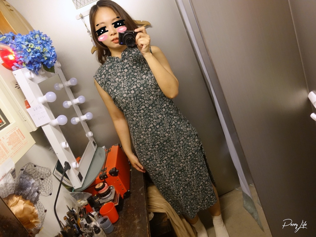 試穿旗袍中,第一次選的尺寸穿的時候有點太緊,後來換了一個尺寸就蠻剛好的,也可請老闆娘量一下適合的大小,可以更快找到適合的旗袍,穿好旗袍後就可以來場復古的大稻埕小旅行啦。